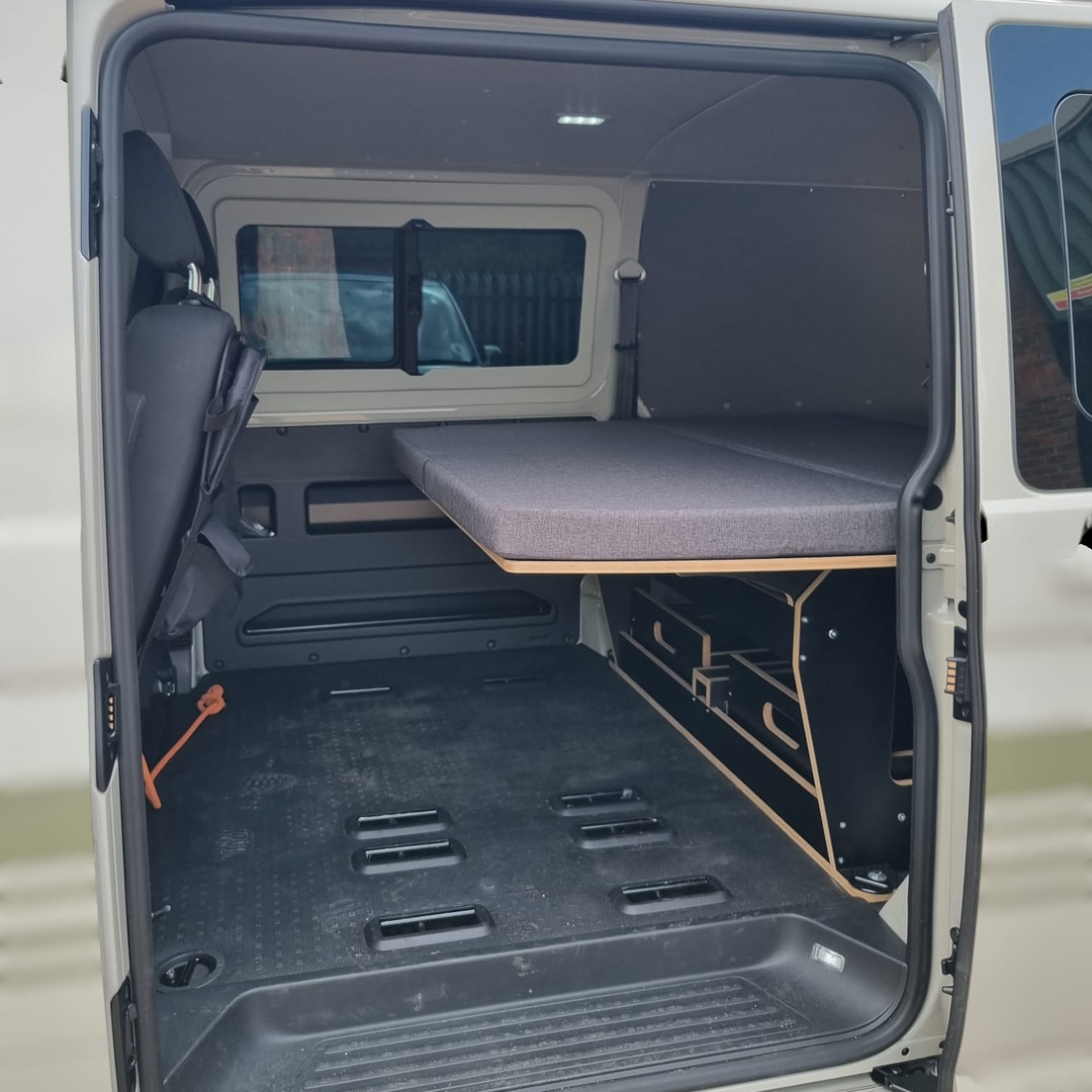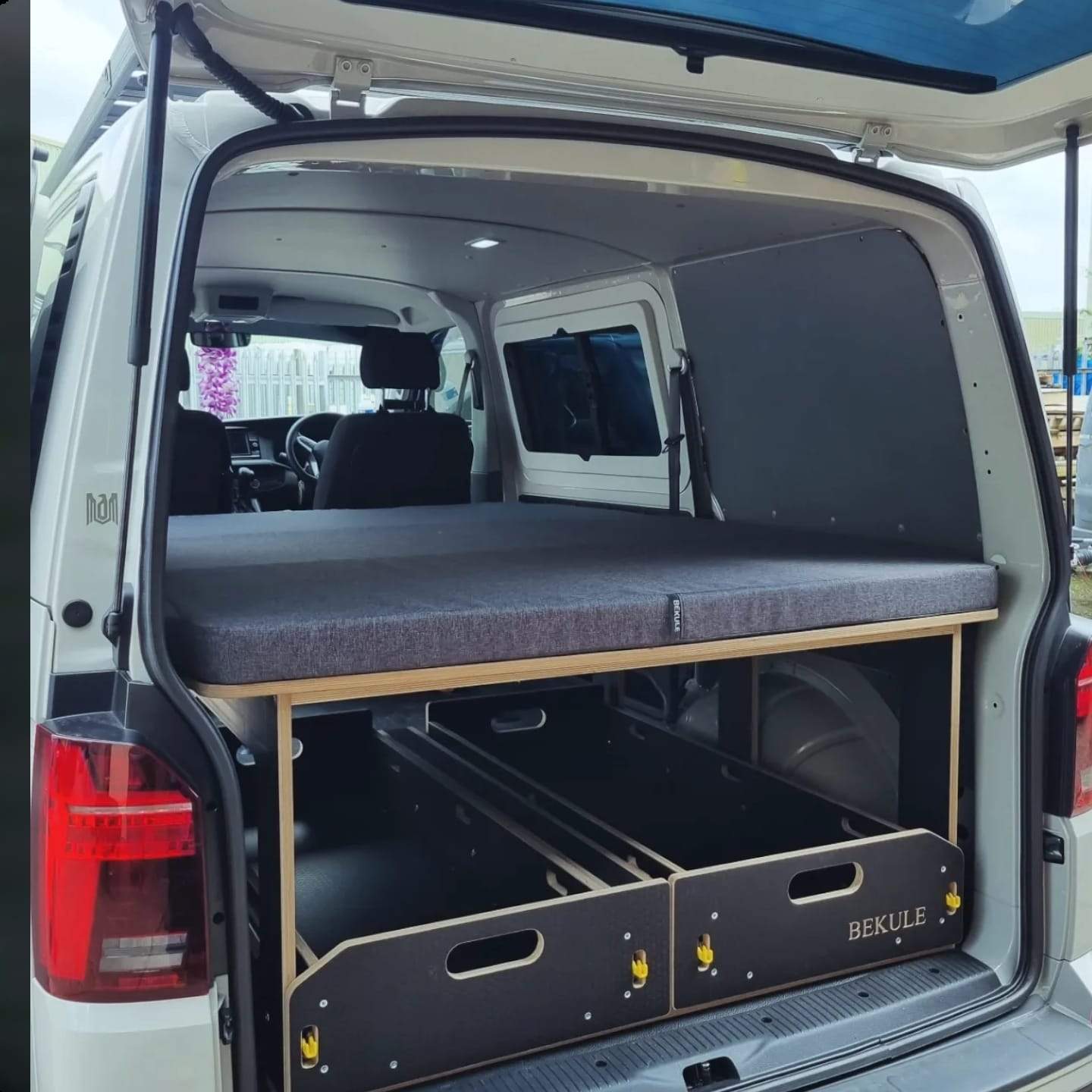 It can be used for everyday work with its 2x 200kg rated drawer runners (we advise a 150kg each drawer limit for regular use as all runners on the market are not ideal for 200kg).When in use with the Kombi When in use with the Kombi t5-t6 the seats can fold down and the bulkhead of the pod folds to form a platform big enough for our full size double mattress or an 8×4 foot sheet board